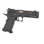La pistola SA-VGP09 VAPOR™ del fabricante Specna Arms es una pistola de Green Gas diseñada para jugadores más experimentados que esperan una calidad de trabajo, buena ergonomía, todo lo que te permitirá dominar el campo de airsoft durante las partidas de combate cuerpo a cuerpo. Está fabricado principalmente de metal (la base de la culata, la culata y su base, el guardamontador y el mecanismo de amartillamiento son de acero), con solo los revestimientos del mango y la recámara de polímero.